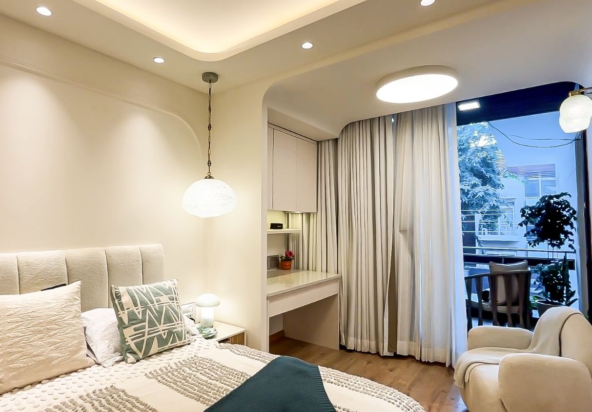 The result is a softly layered white bedroom where curves replace sharp edges. Curved false ceilings and mouldings bring flow to the space, while arched shutter details add subtle character. Natural wooden elements balance the white palette, keeping the room warm and grounded.