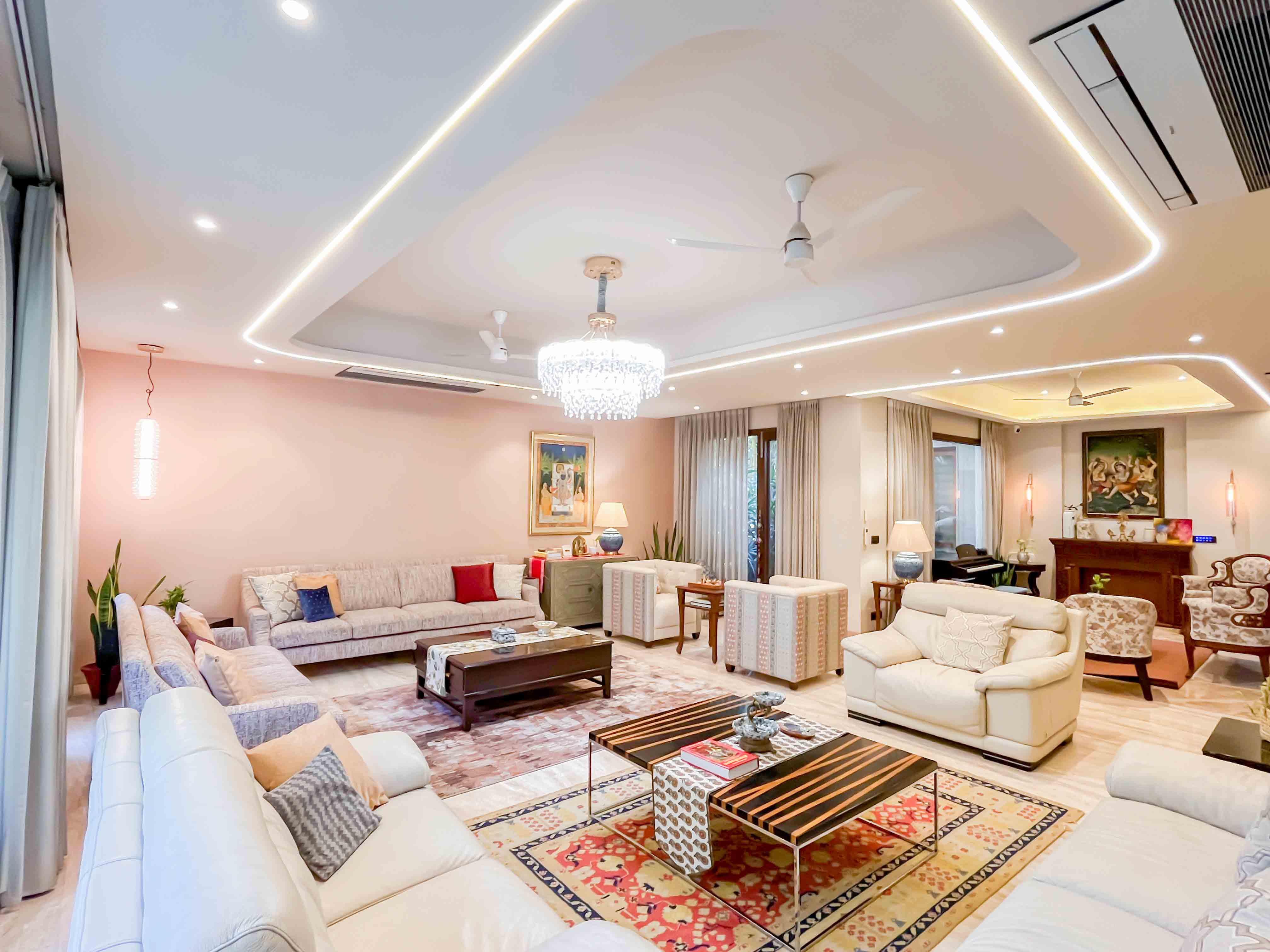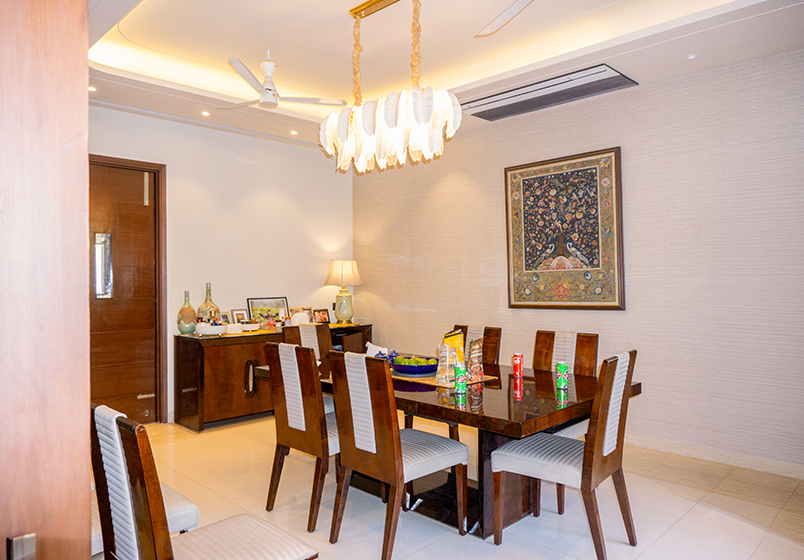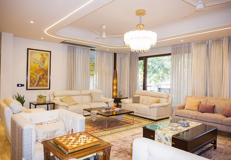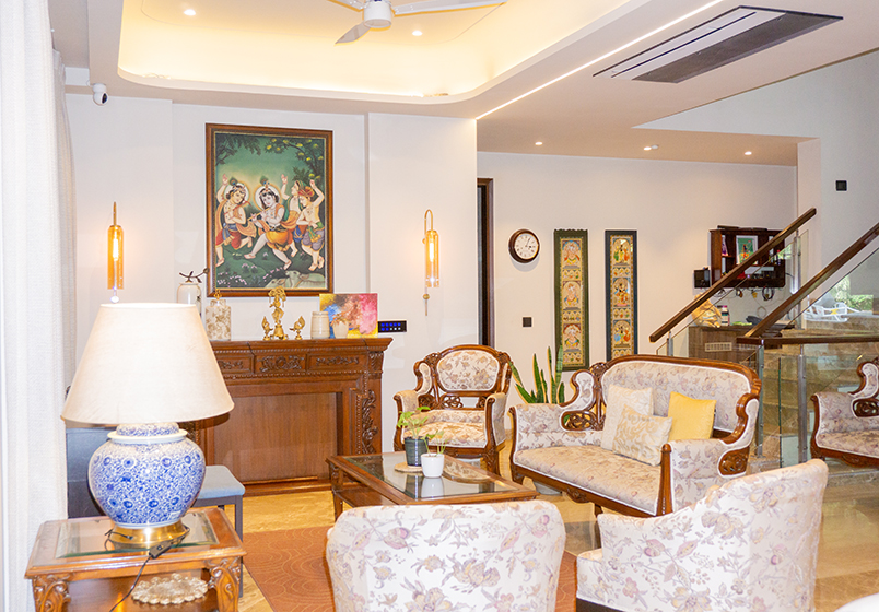 This renovation project in a villa in DLF Phase 1 focused on transforming a previously dark and heavy interior into a brighter, more open living environment. The existing ceilings and air-conditioning layout created a sense of visual heaviness and limited comfort, prompting the client to shift to a VRV air-conditioning system.