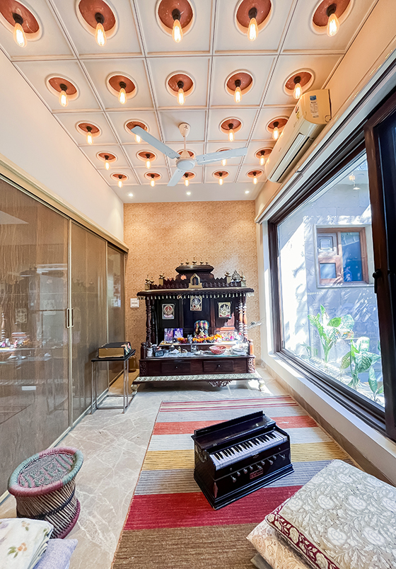 The existing mandir ceiling was enhanced using terracotta plates paired with filament lights, adding a traditional yet artistic touch. In the backyard, terracotta and printed tiles were introduced to transform what was previously an unused space into a functional outdoor area, with dedicated space for generators and services.