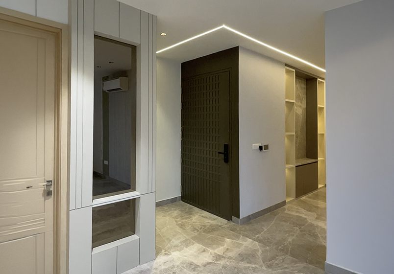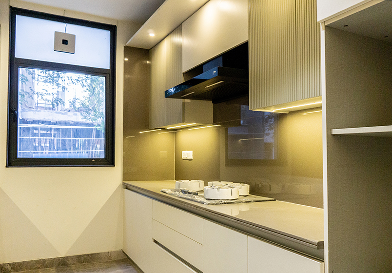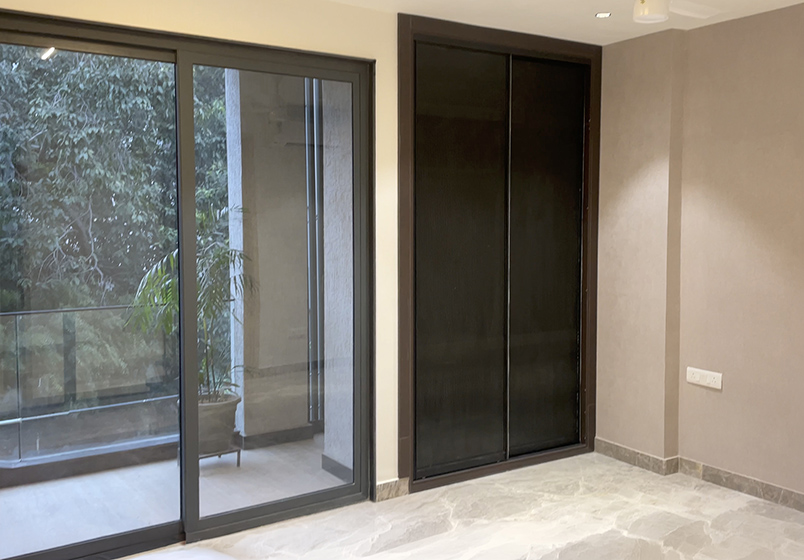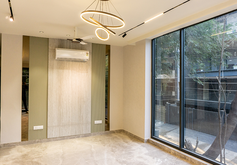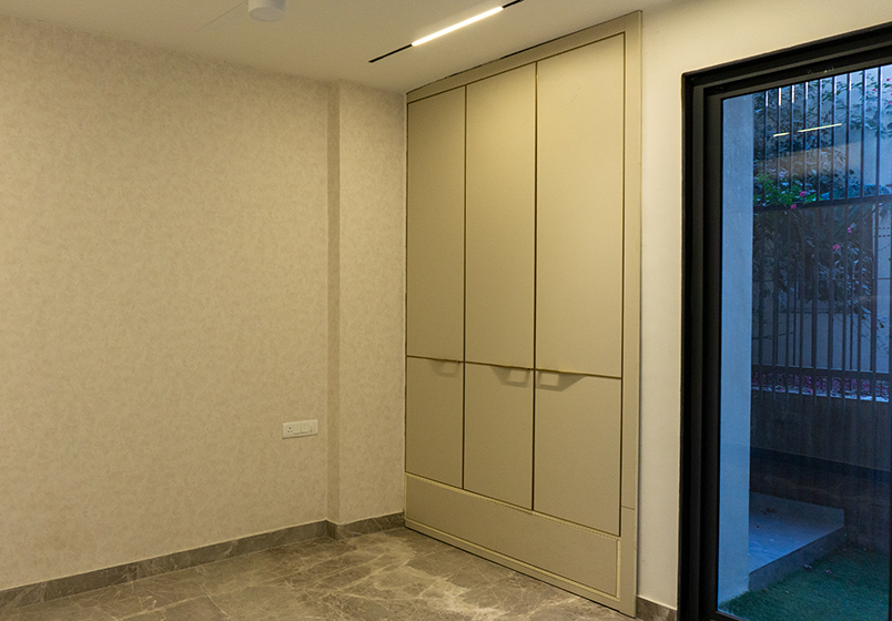 The kitchen was equipped with generous storage, modular fittings, premium woodwork, and layered lighting to enhance both function and style. We used high-end Italian flooring throughout each of the homes. Bedrooms included sleek wardrobes with integrated lighting and metal-framed tinted glass for a refined, contemporary finish.