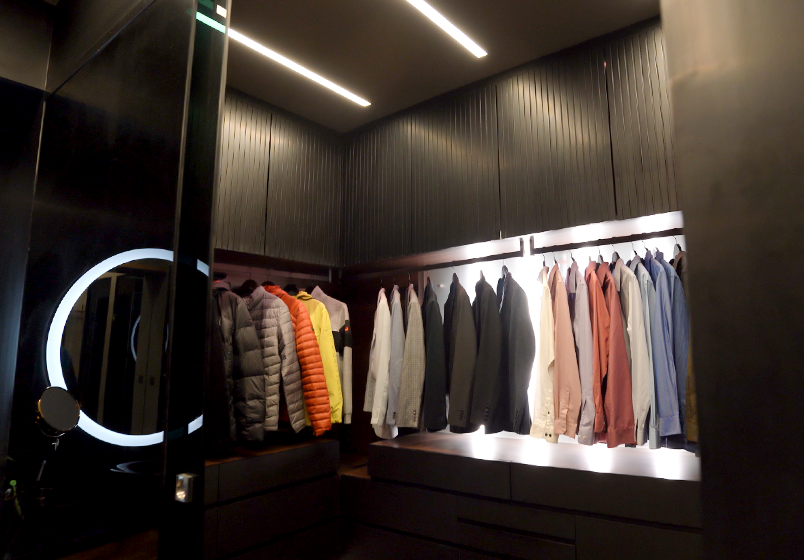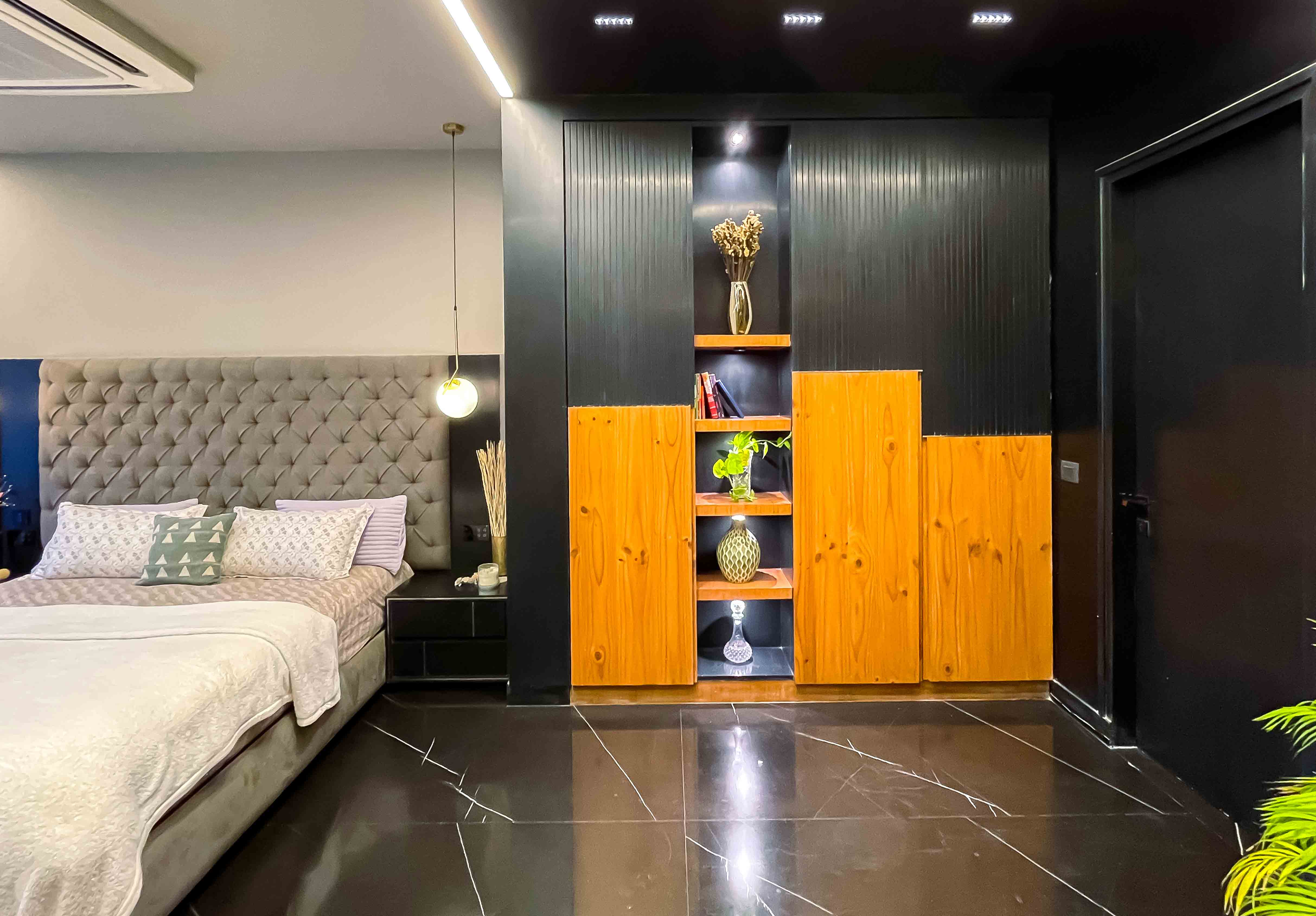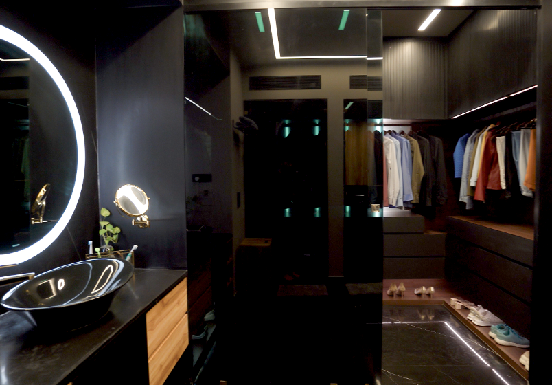 The client wanted a luxurious, black-themed bedroom with Italian marble, sleek accents, and statement lighting. A stylish walk-in wardrobe was essential for seamless functionality, along with a cozy den designed for relaxation, complete with plush seating and a projector setup.