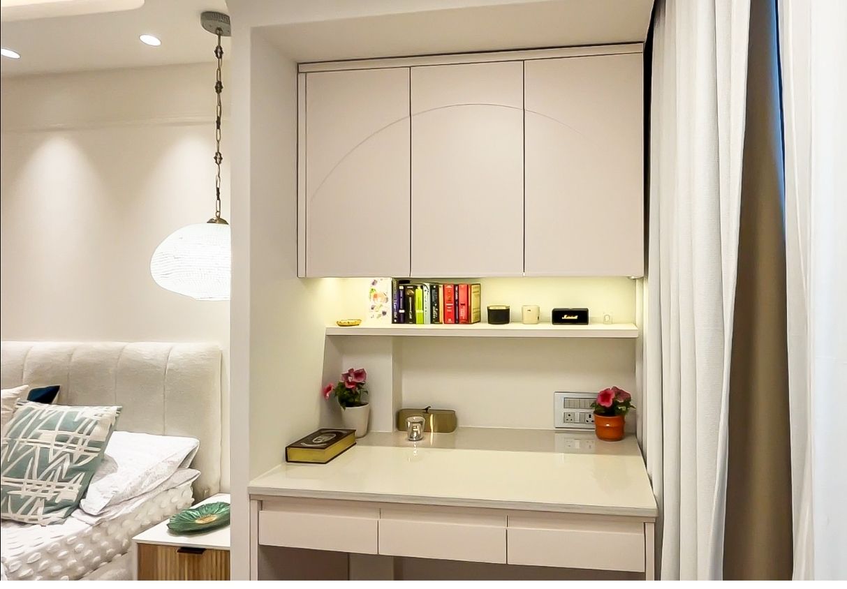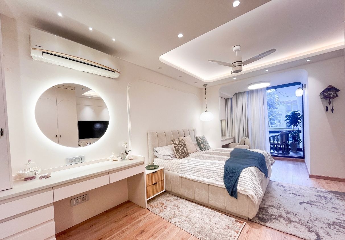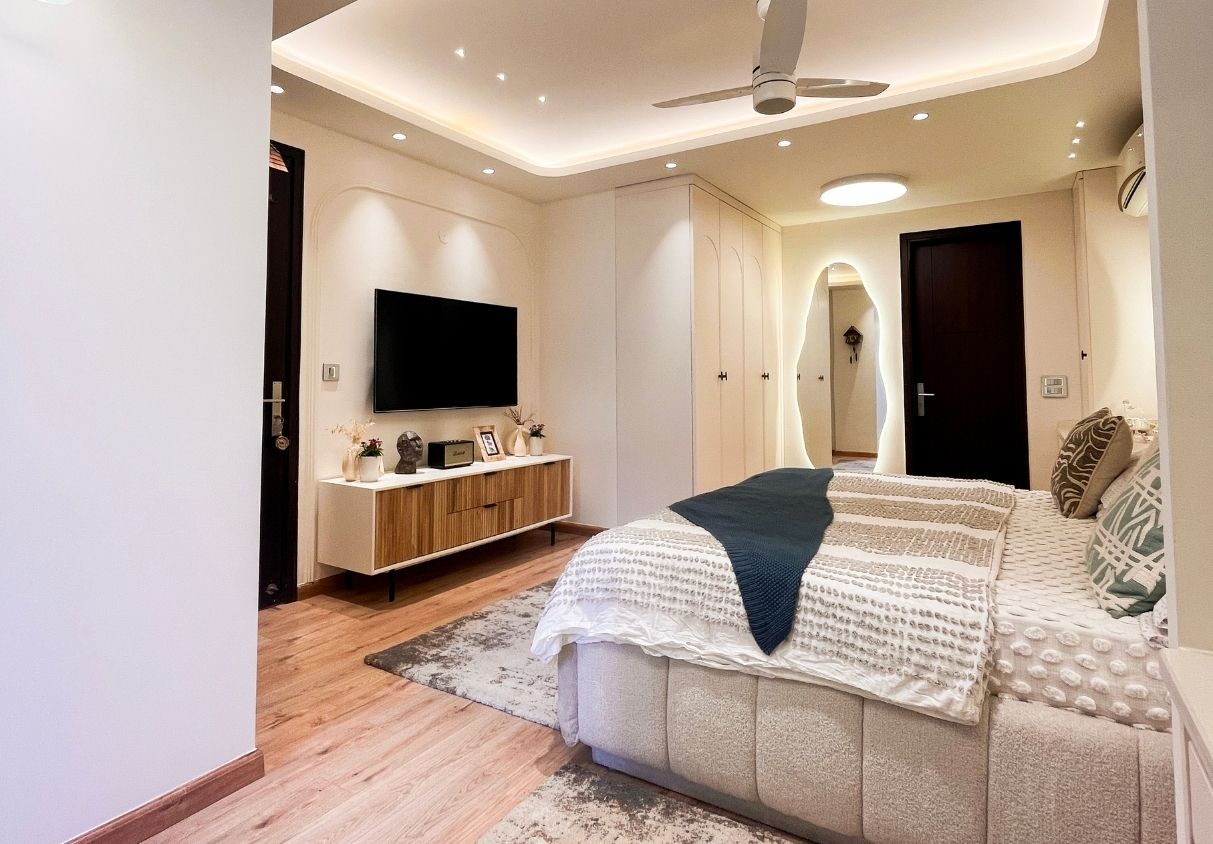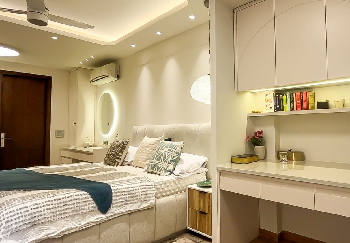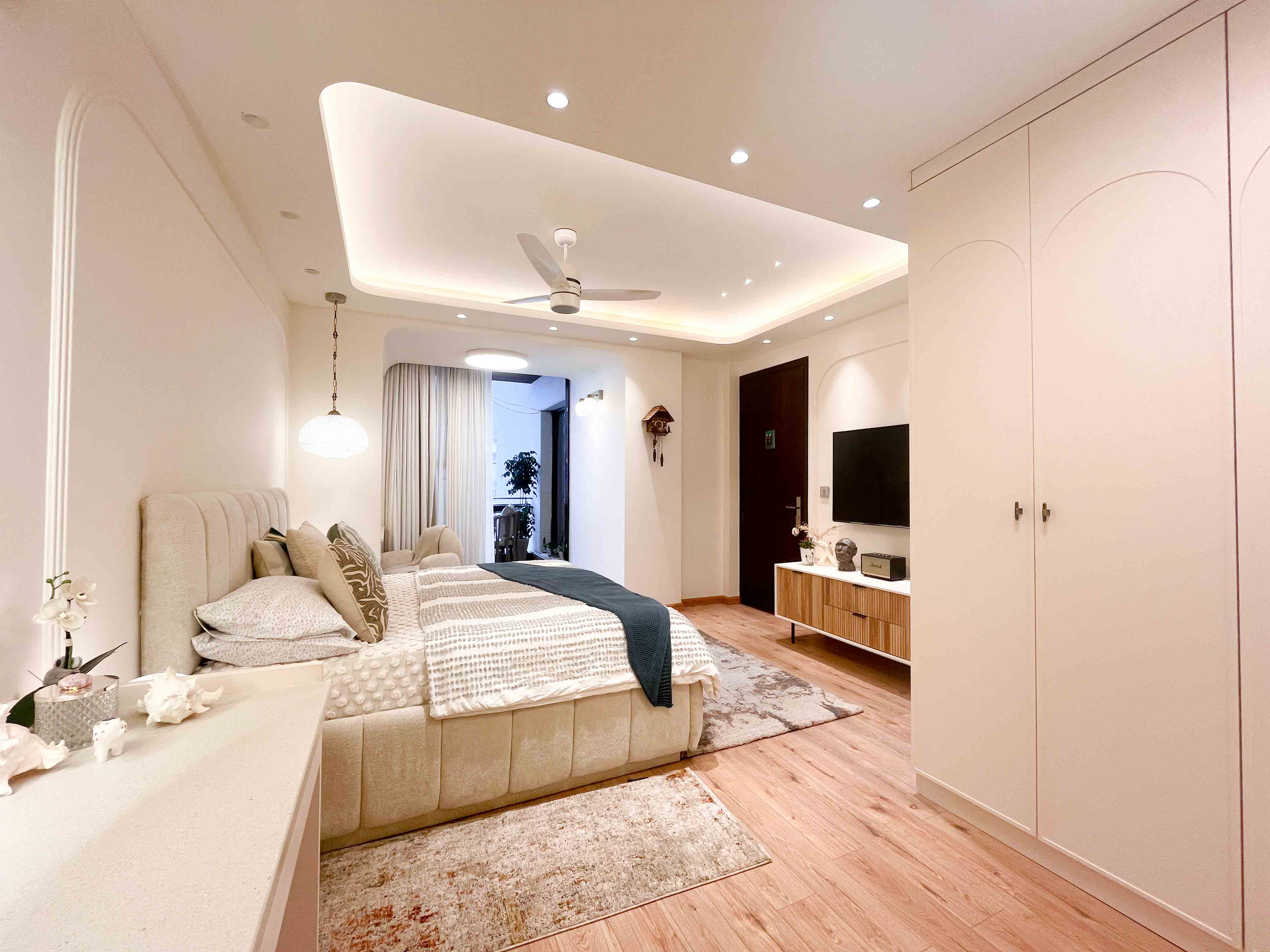 The result is a softly layered white bedroom where curves replace sharp edges. Curved false ceilings and mouldings bring flow to the space, while arched shutter details add subtle character. Natural wooden elements balance the white palette, keeping the room warm and grounded.