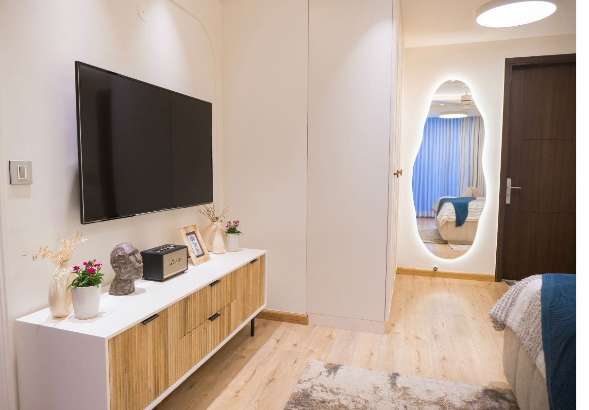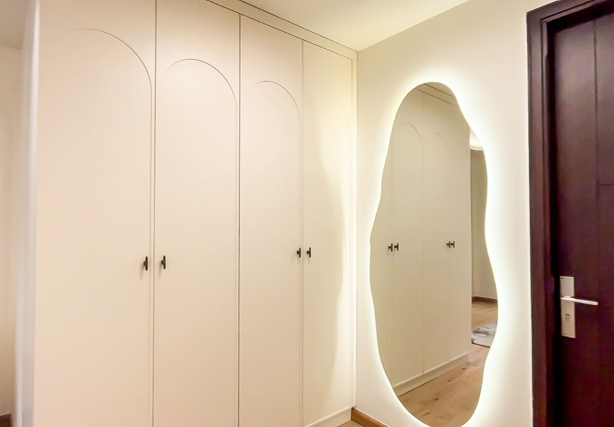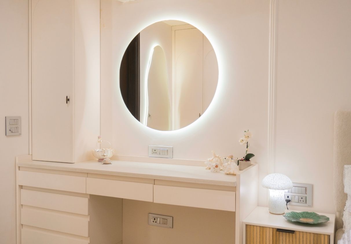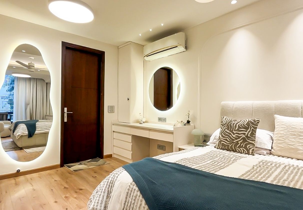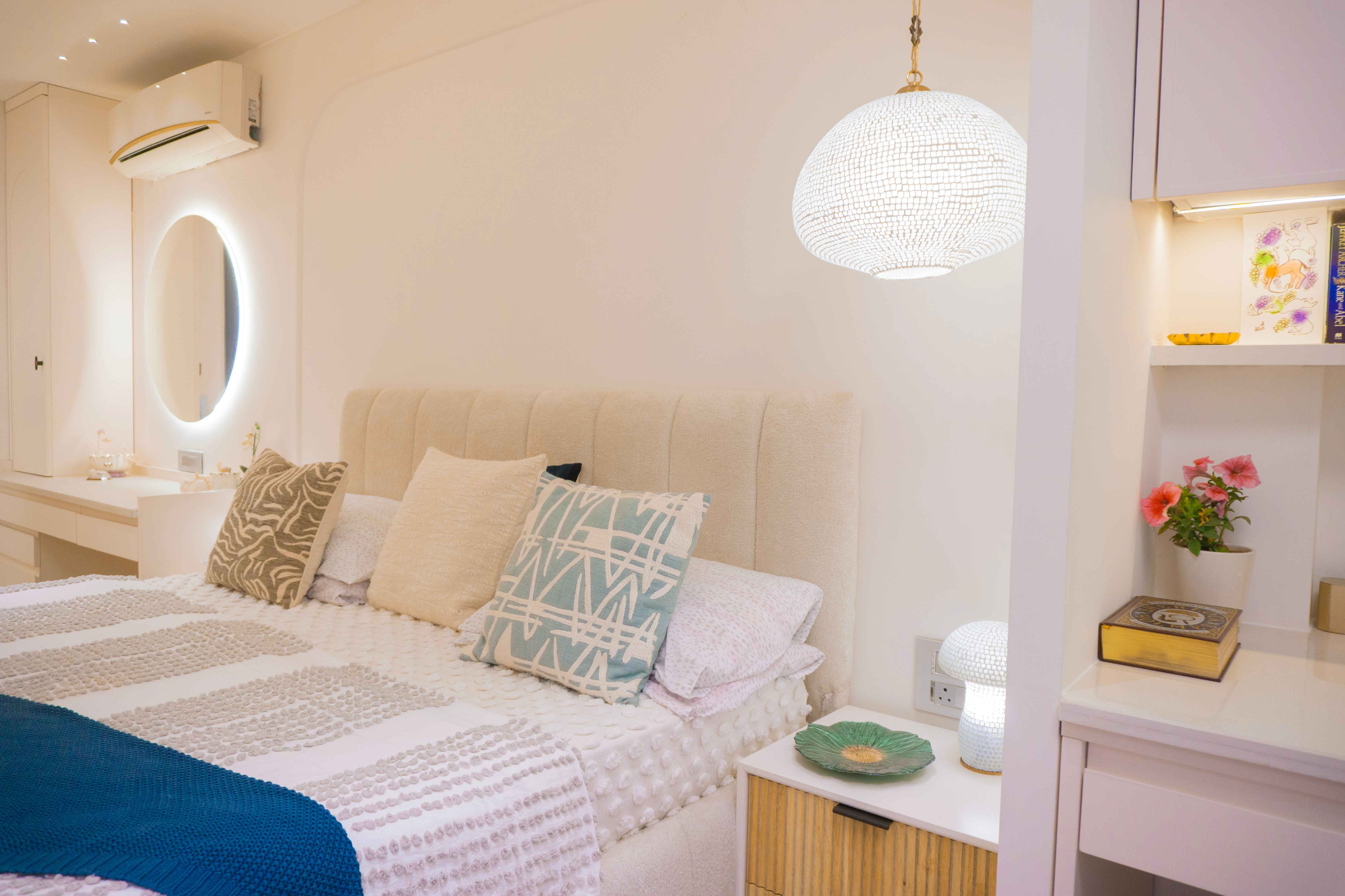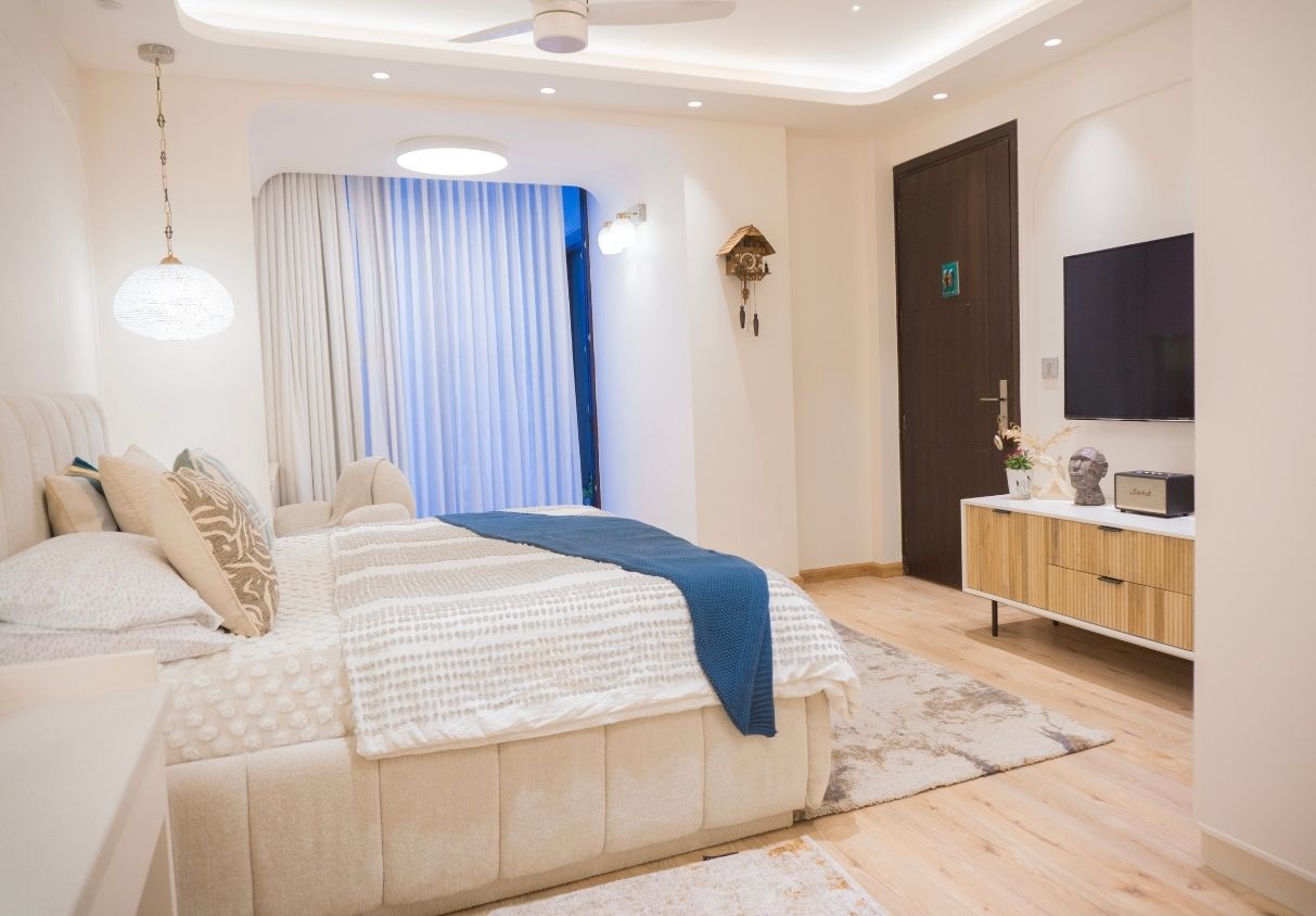 The result is a softly layered white bedroom where curves replace sharp edges. Curved false ceilings and mouldings bring flow to the space, while arched shutter details add subtle character. Natural wooden elements balance the white palette, keeping the room warm and grounded.