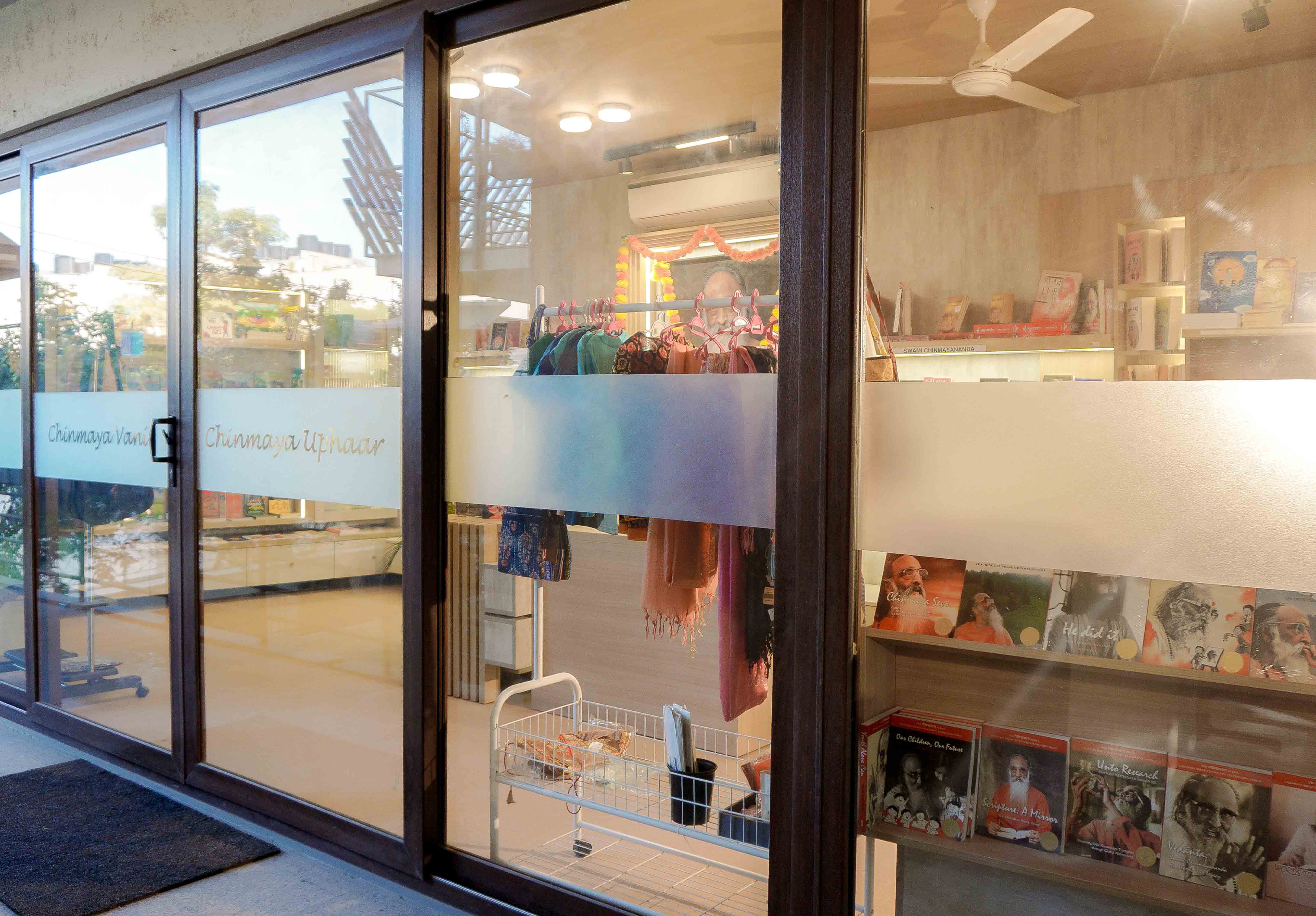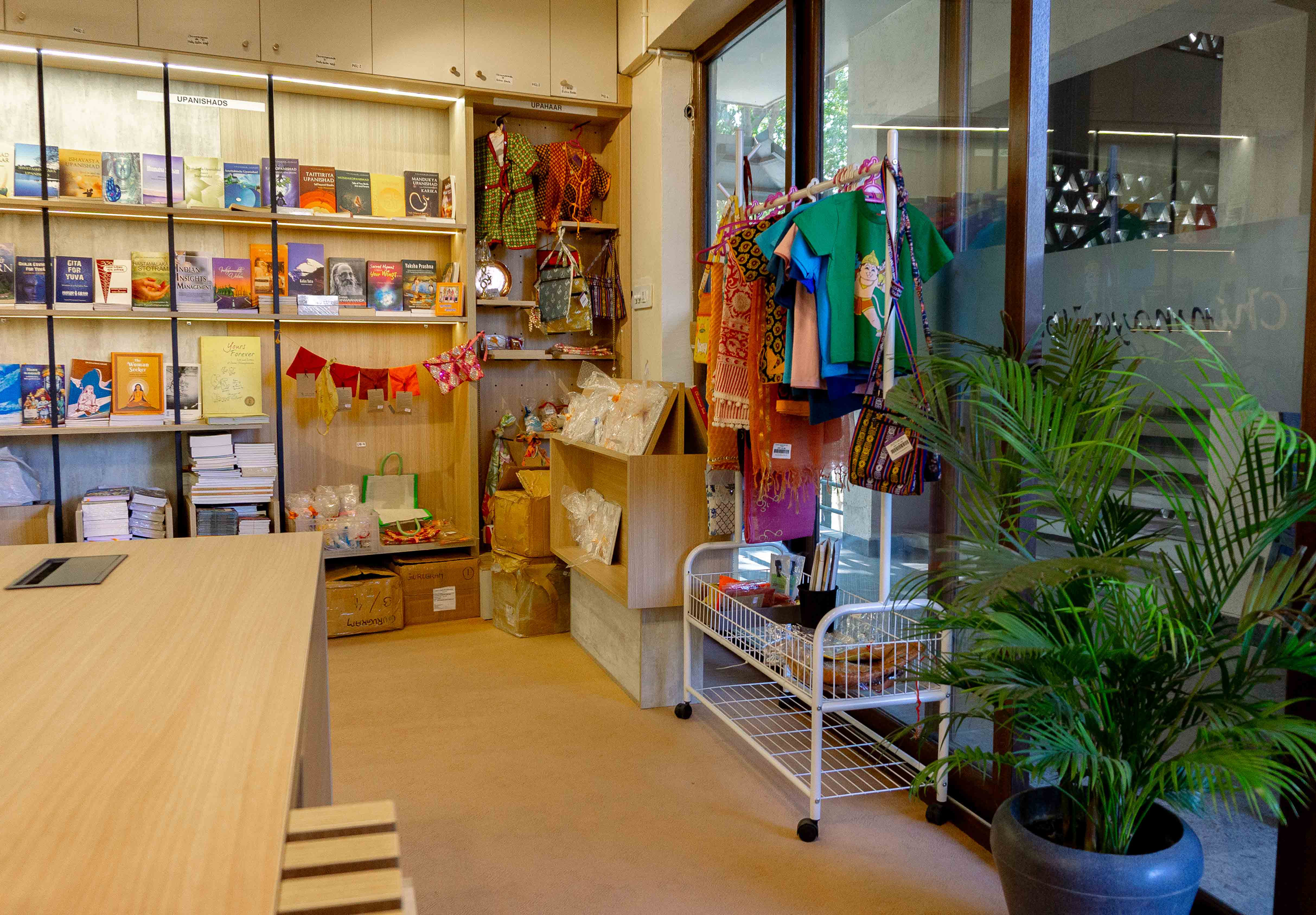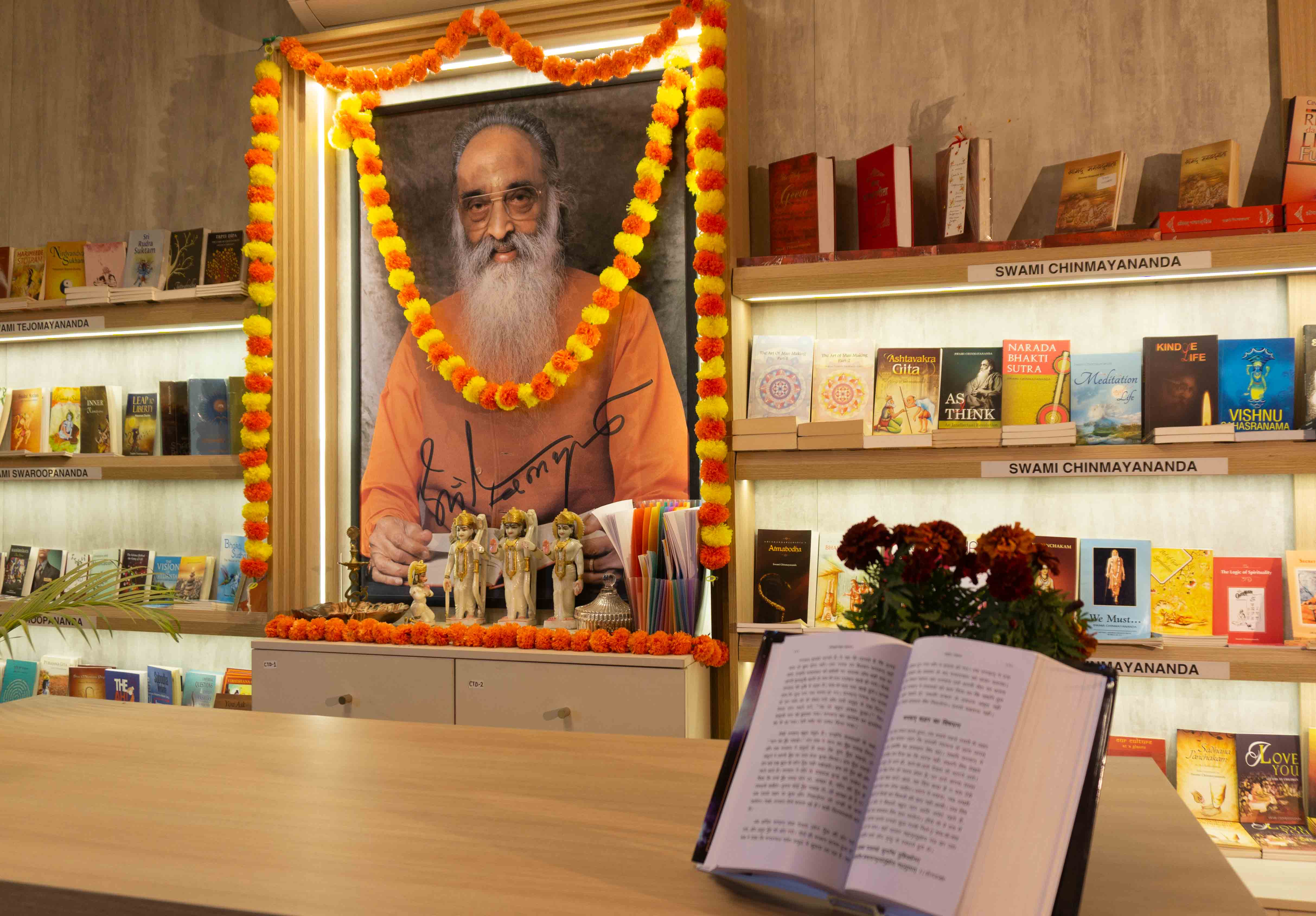 The space is a 325 sq. ft. bookstore in Sector 50, inspired by Swami Chinmayananda Saraswati and Hindu spirituality, with a focus on tradition, presence, and identity.