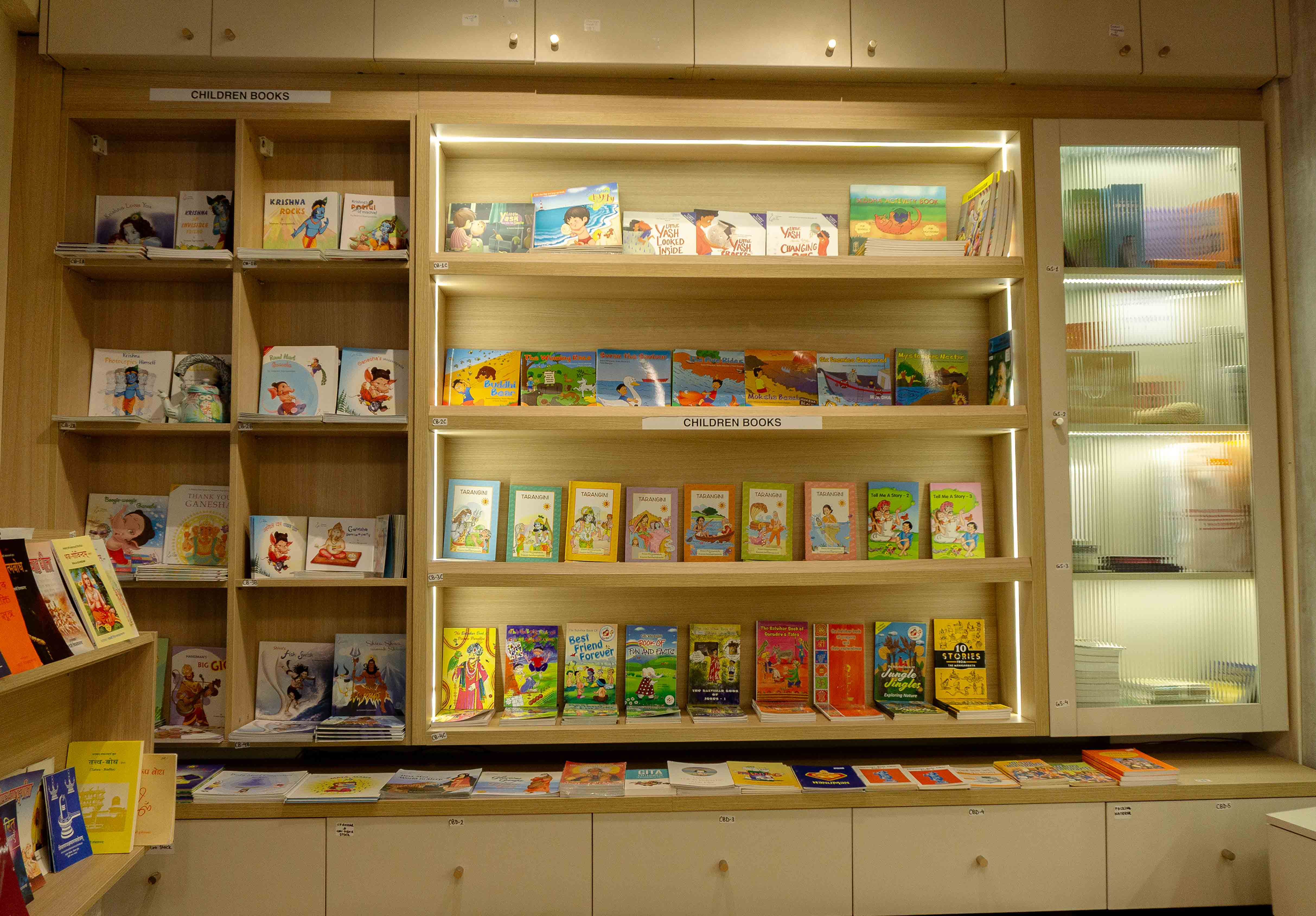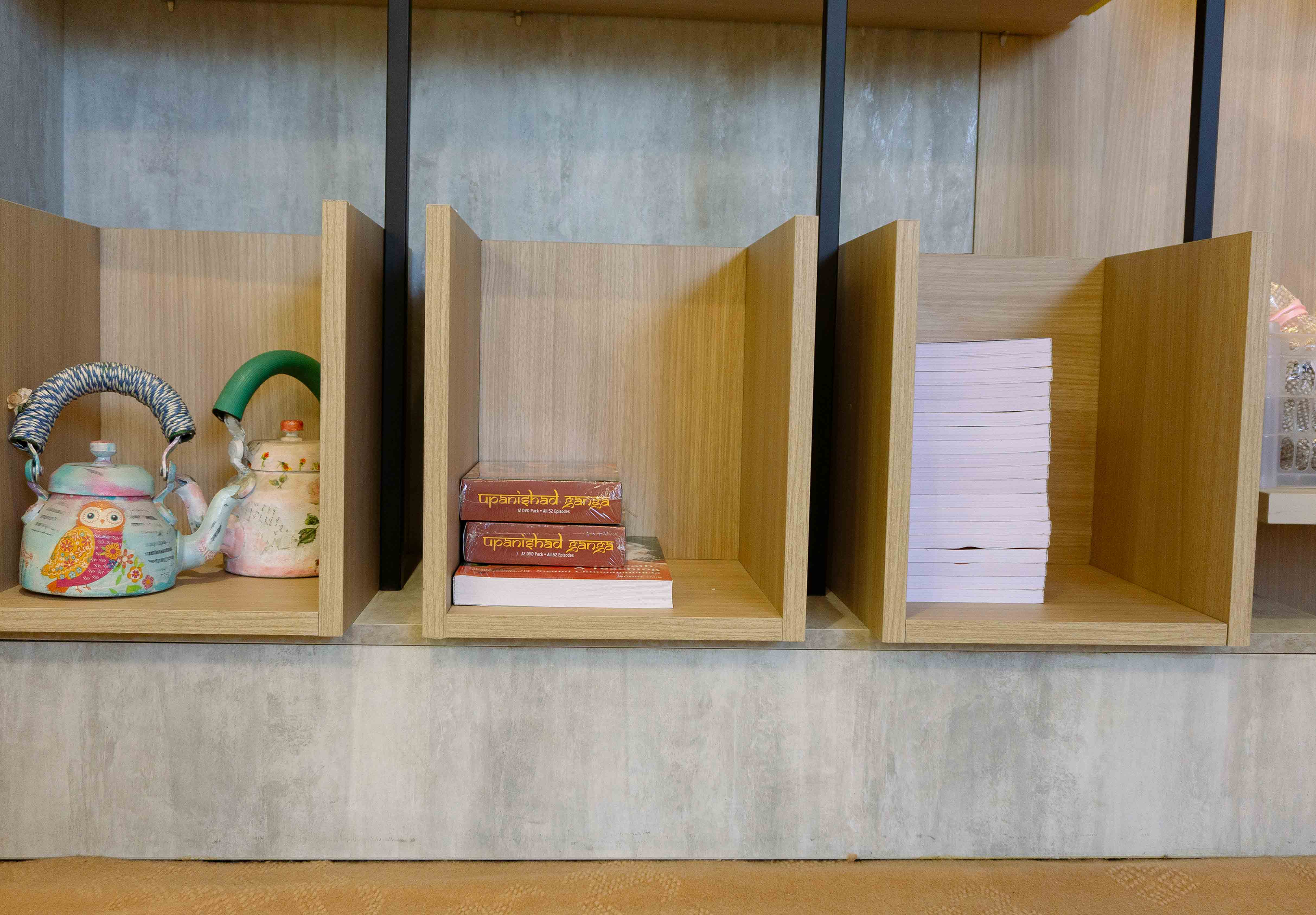 We designed the bookstore with fluted glass cabinets to balance privacy and openness. Light wooden laminate on the flooring, walls, and furniture introduced warmth, while concrete-finished walls and counters added a contemporary edge.