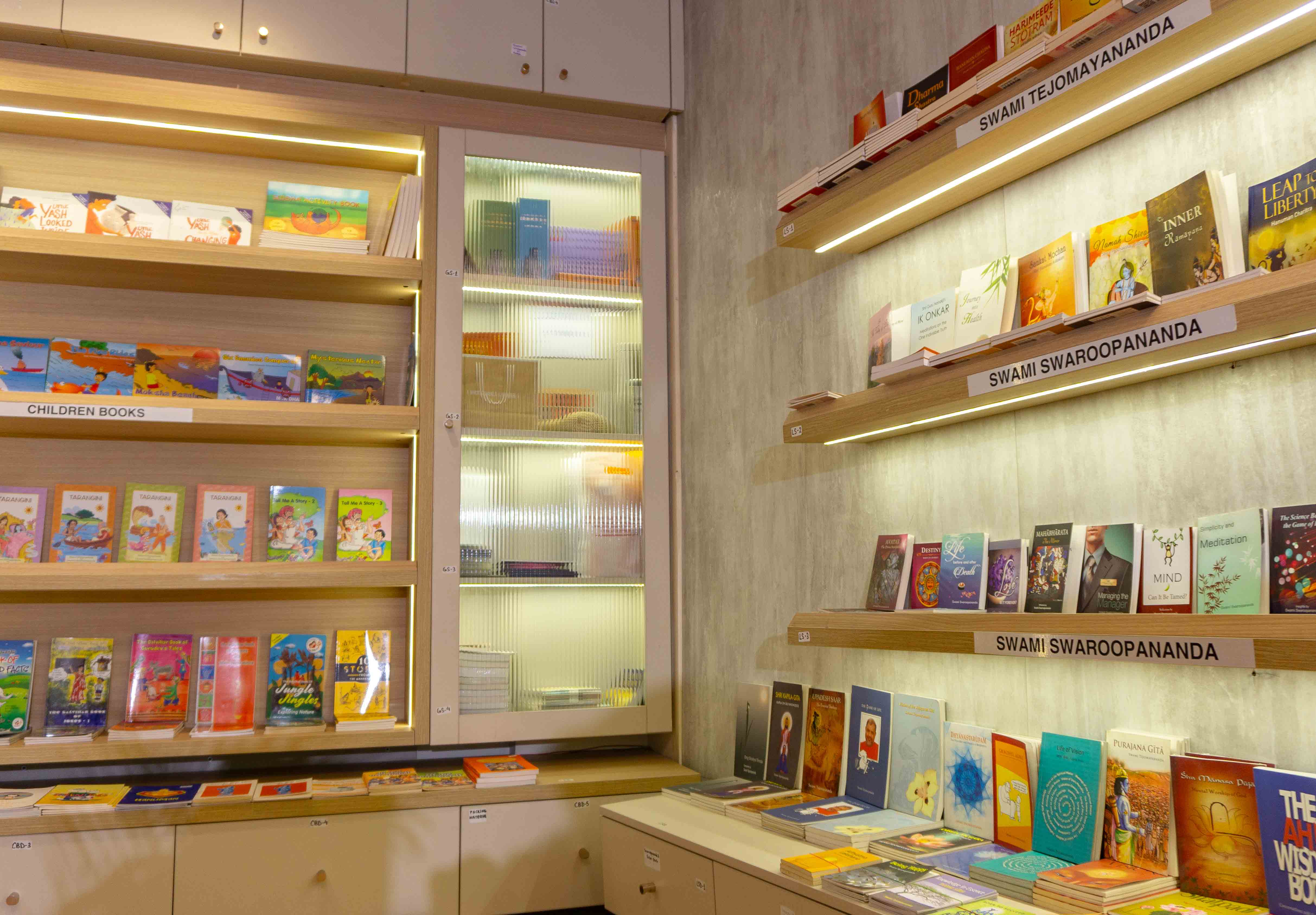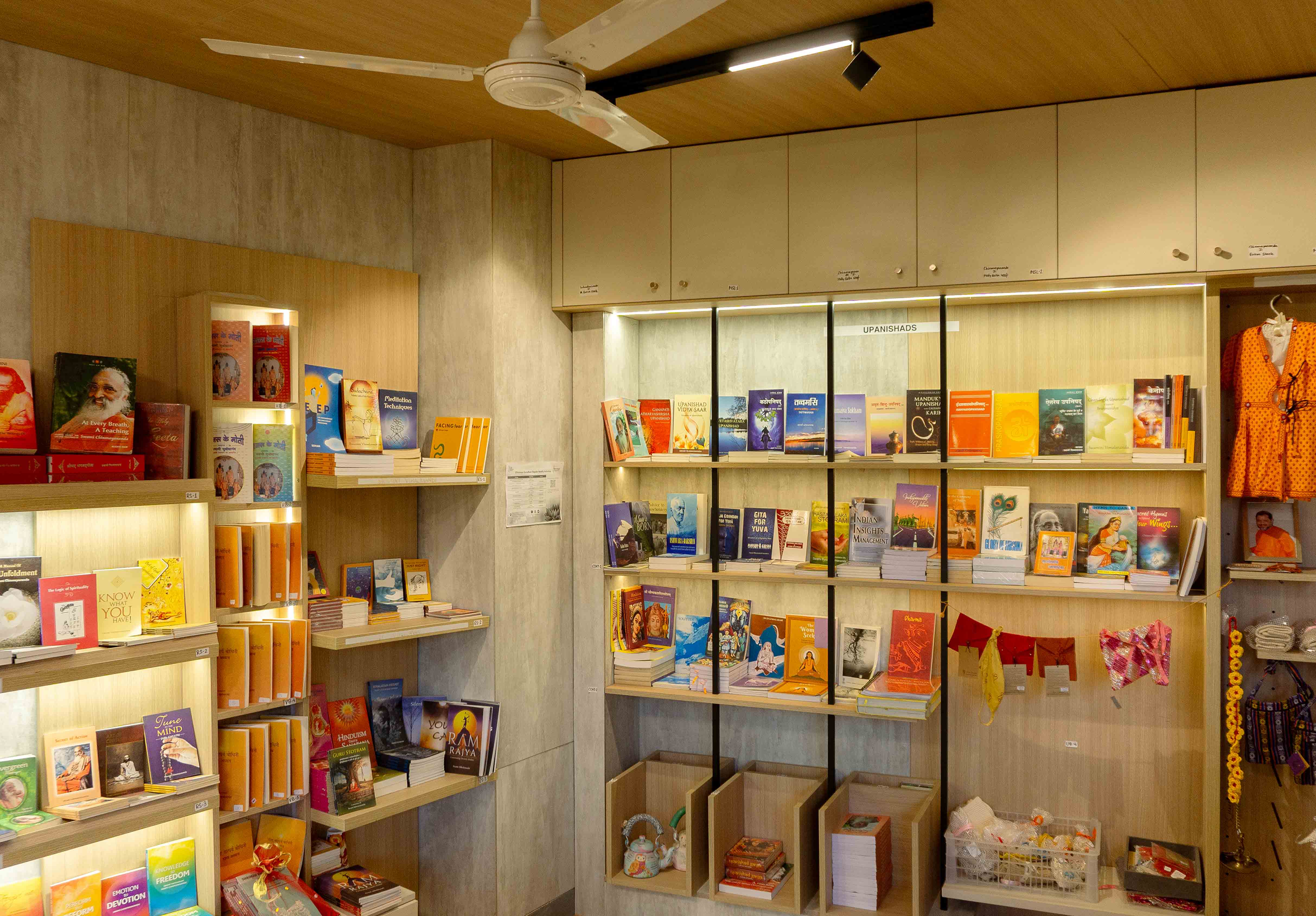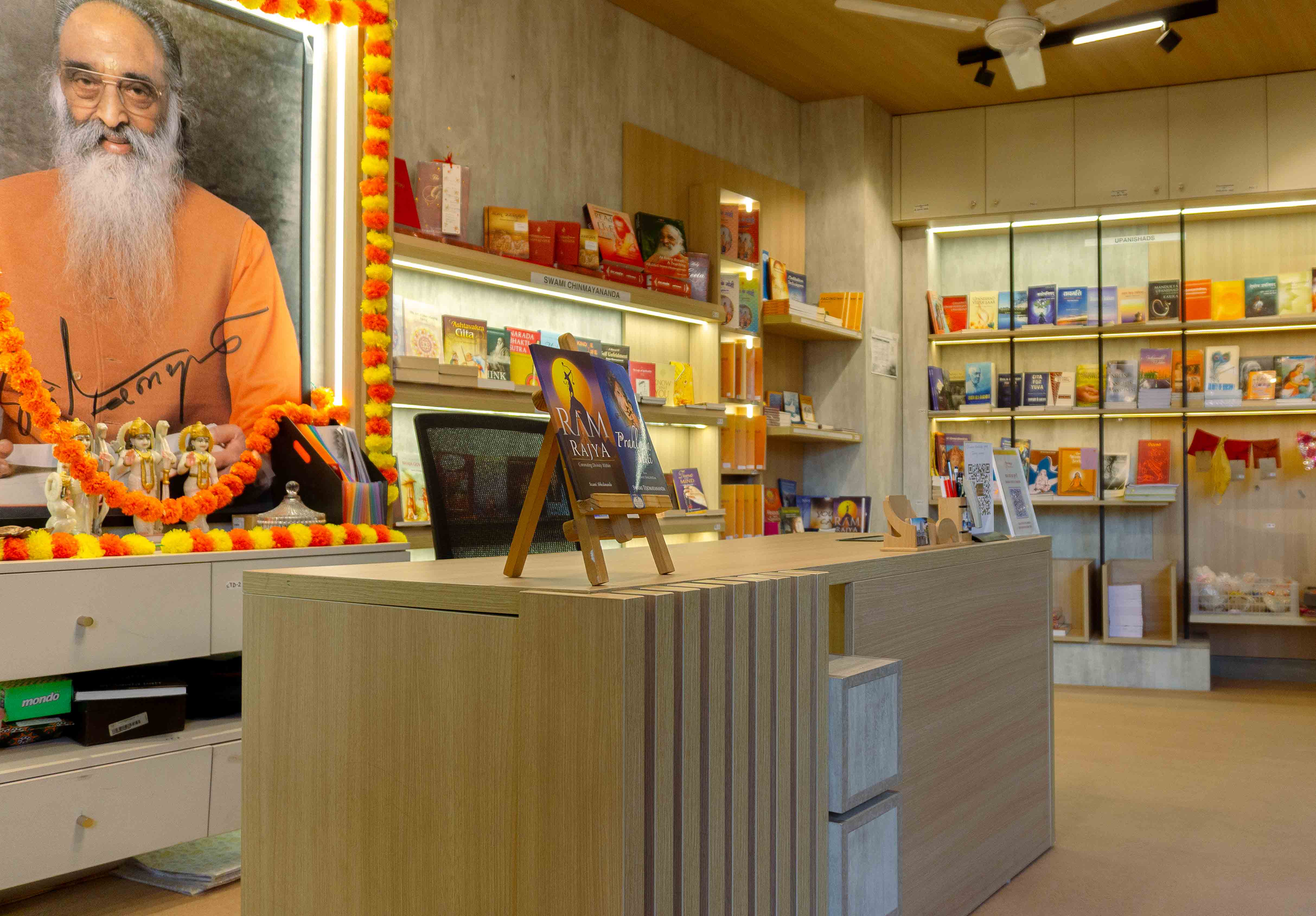 The client wanted a stylish, warm, and premium bookstore with bold contrasts, smart storage solutions, and a grand reception. The space was to be thoughtfully designed around a central portrait of Swami Chinmayananda Saraswati, creating a harmonious blend of functionality and cultural depth