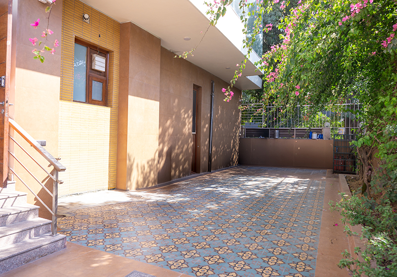 The existing mandir ceiling was enhanced using terracotta plates paired with filament lights, adding a traditional yet artistic touch. In the backyard, terracotta and printed tiles were introduced to transform what was previously an unused space into a functional outdoor area, with dedicated space for generators and services.