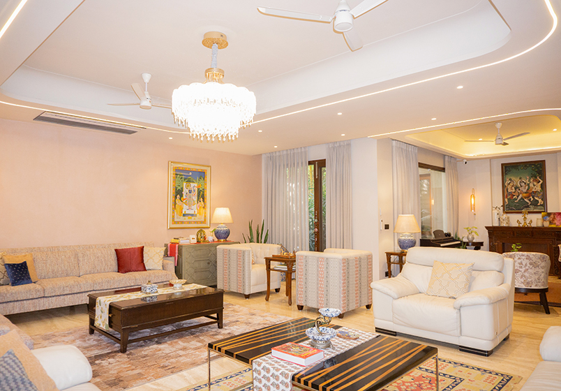 This renovation project in a villa in DLF Phase 1 focused on transforming a previously dark and heavy interior into a brighter, more open living environment. The existing ceilings and air-conditioning layout created a sense of visual heaviness and limited comfort, prompting the client to shift to a VRV air-conditioning system.