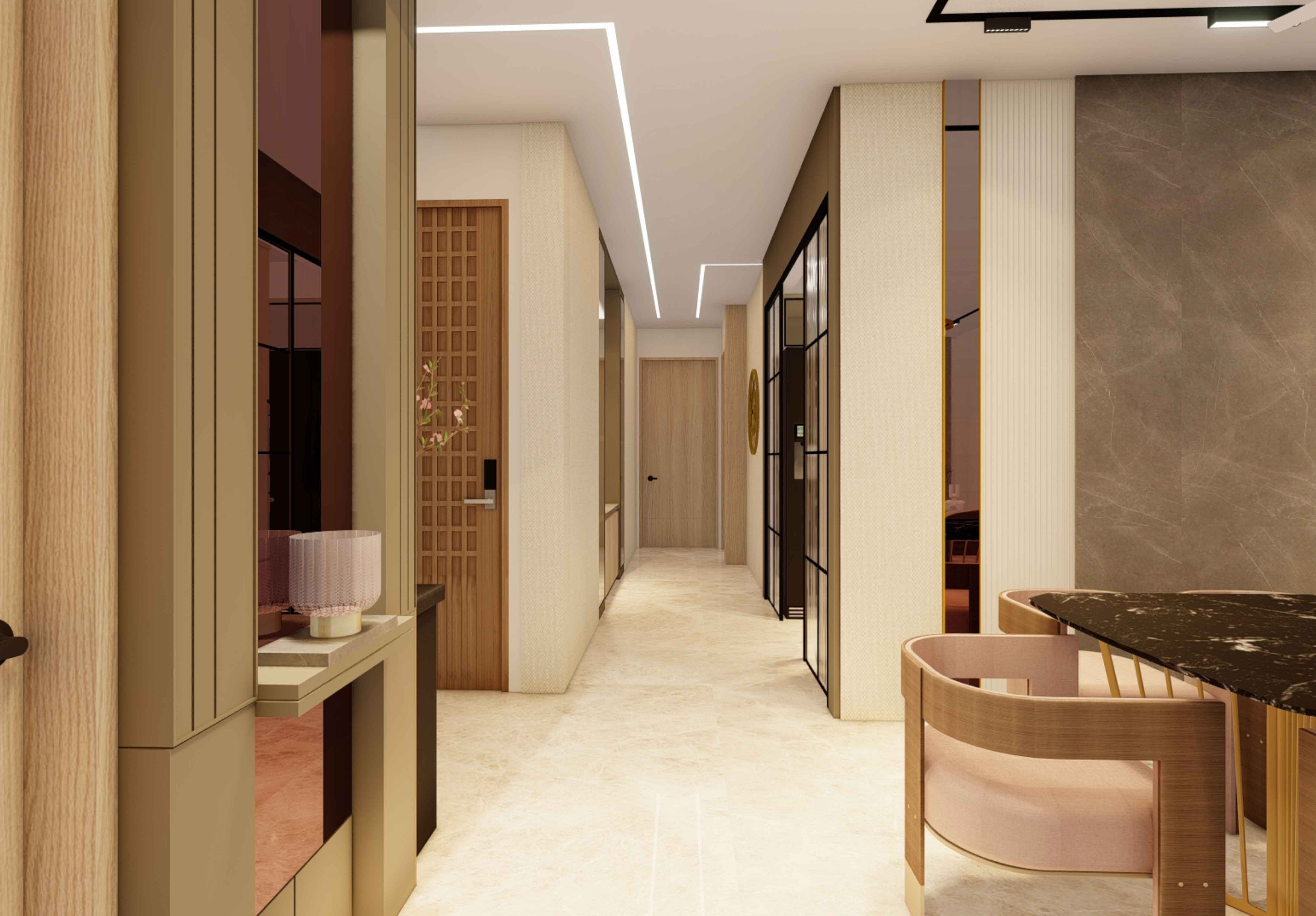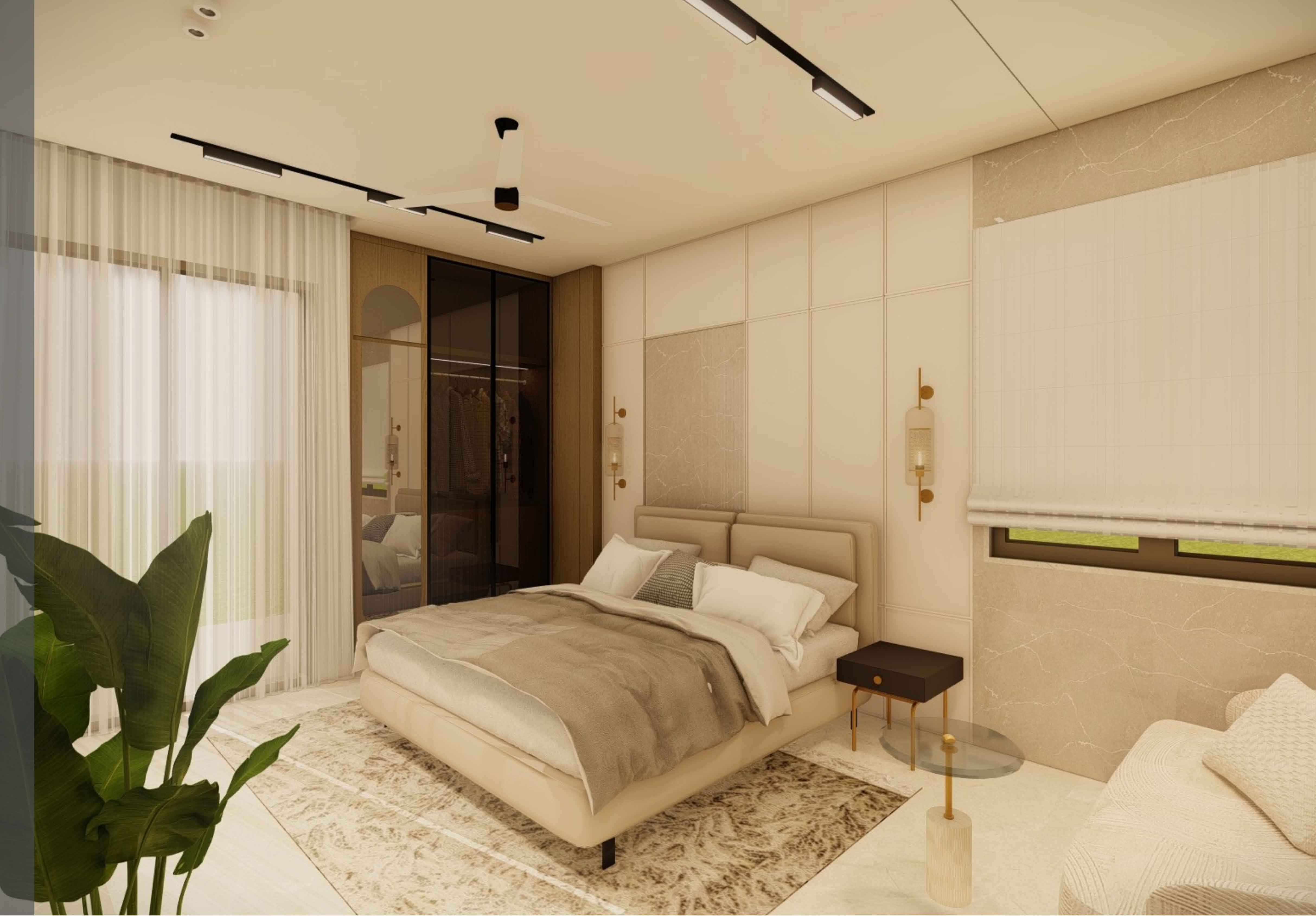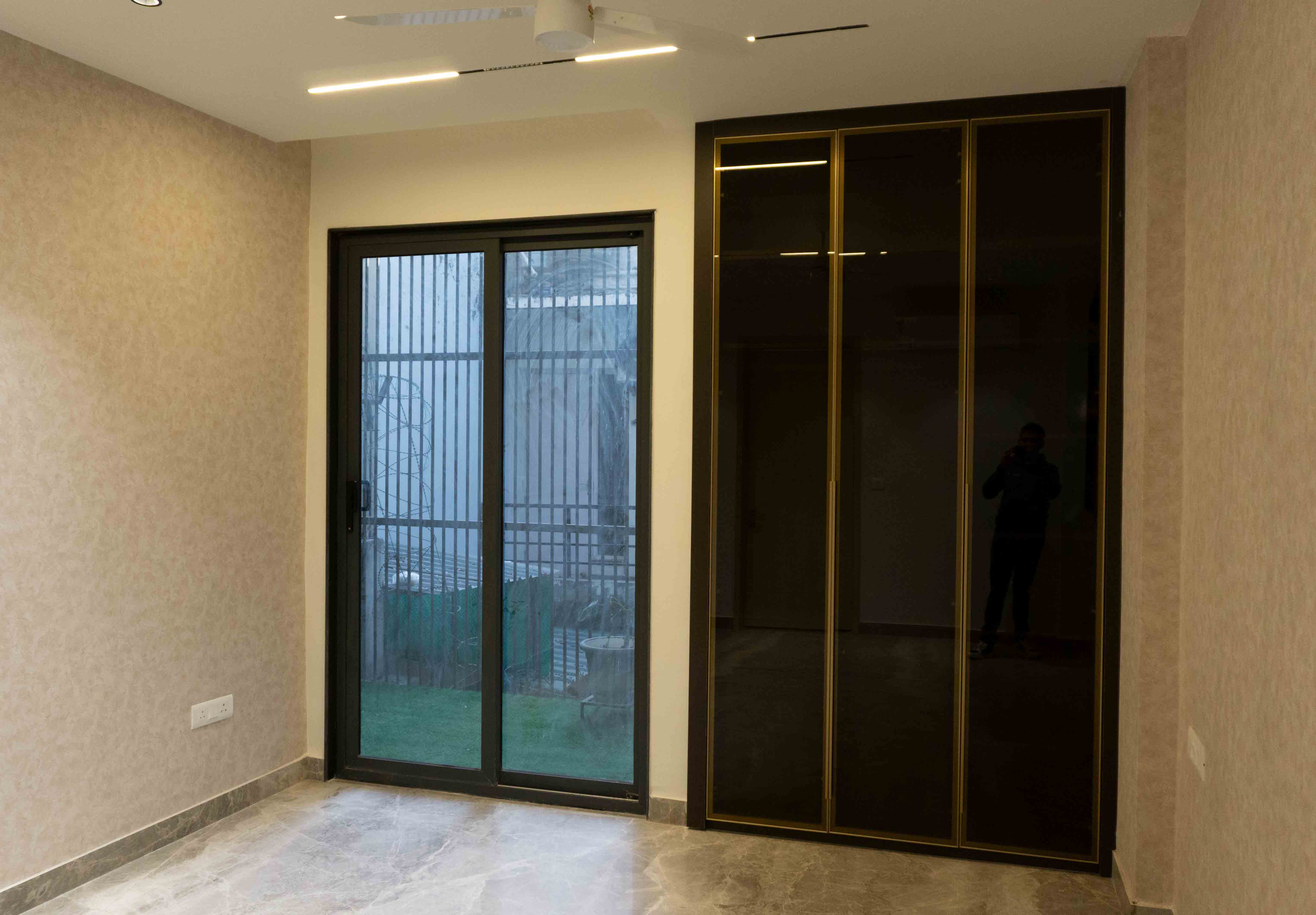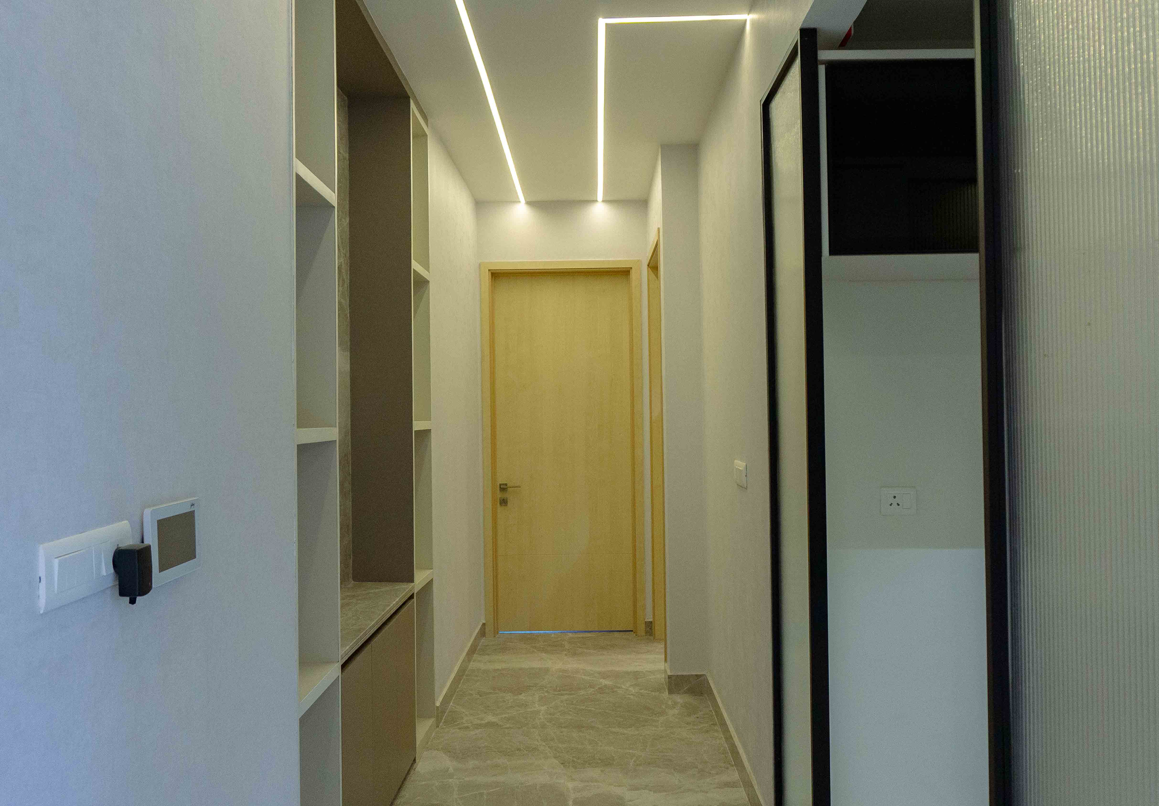 The kitchen was equipped with generous storage, modular fittings, premium woodwork, and layered lighting to enhance both function and style. We used high-end Italian flooring throughout each of the homes. Bedrooms included sleek wardrobes with integrated lighting and metal-framed tinted glass for a refined, contemporary finish.