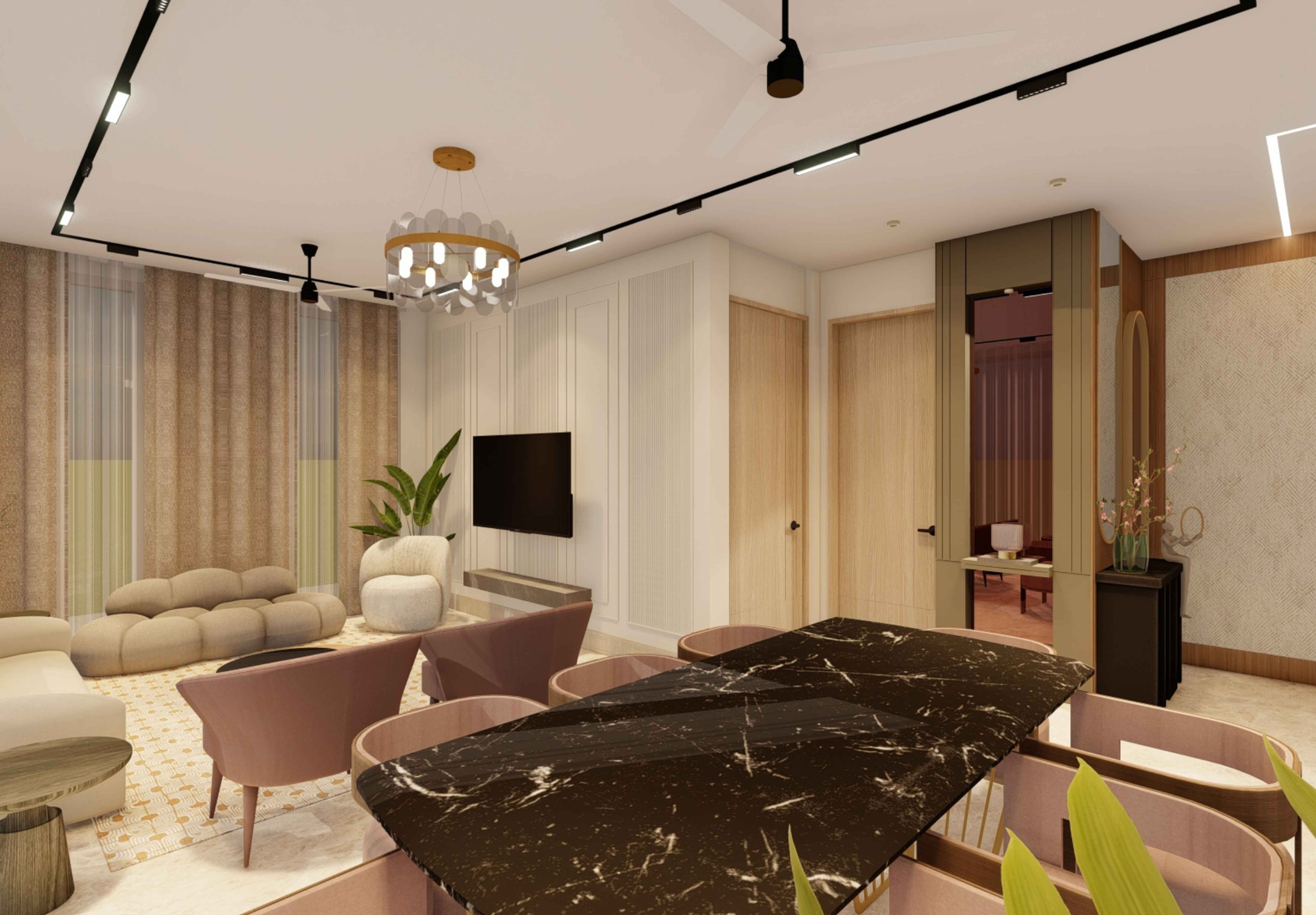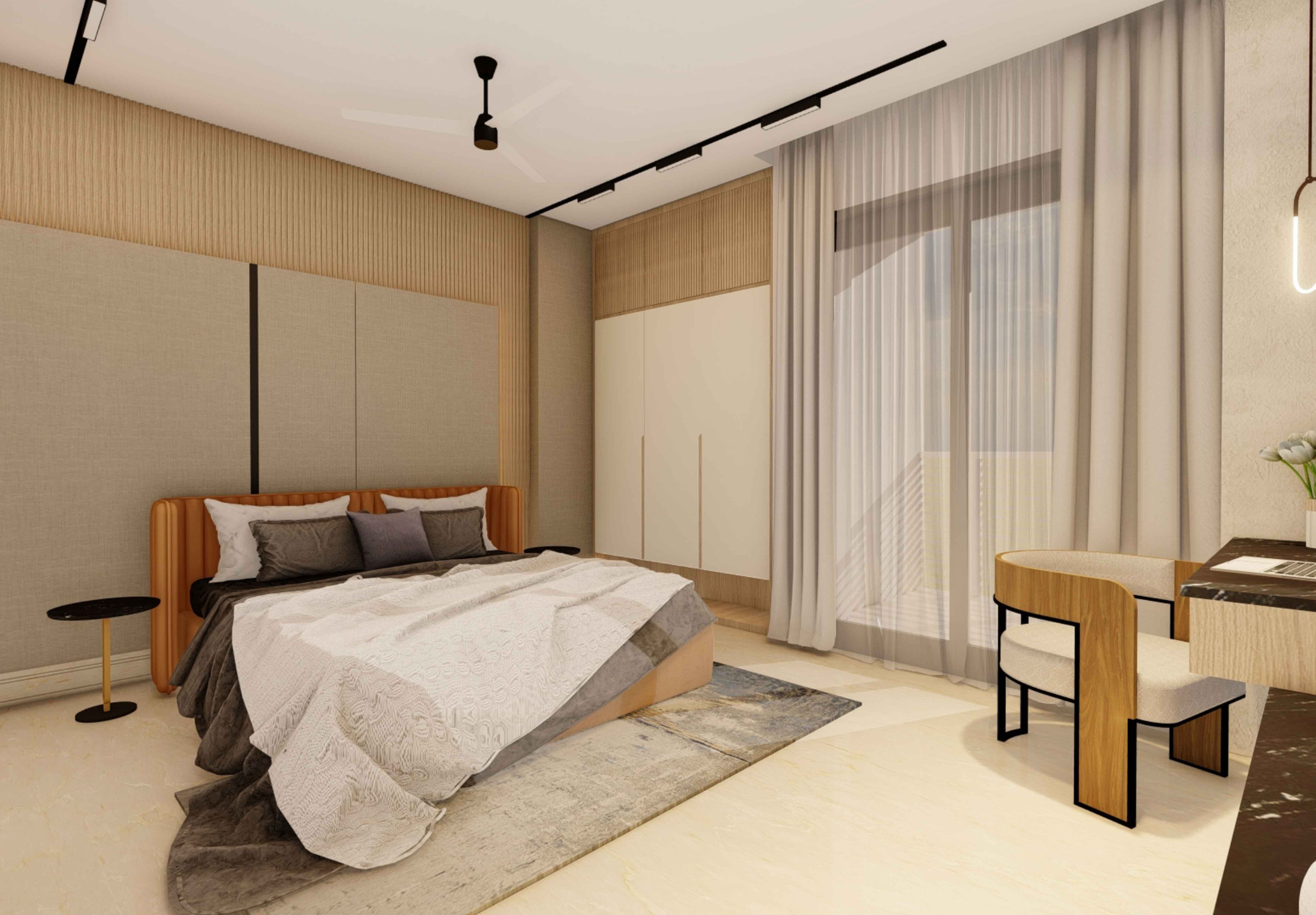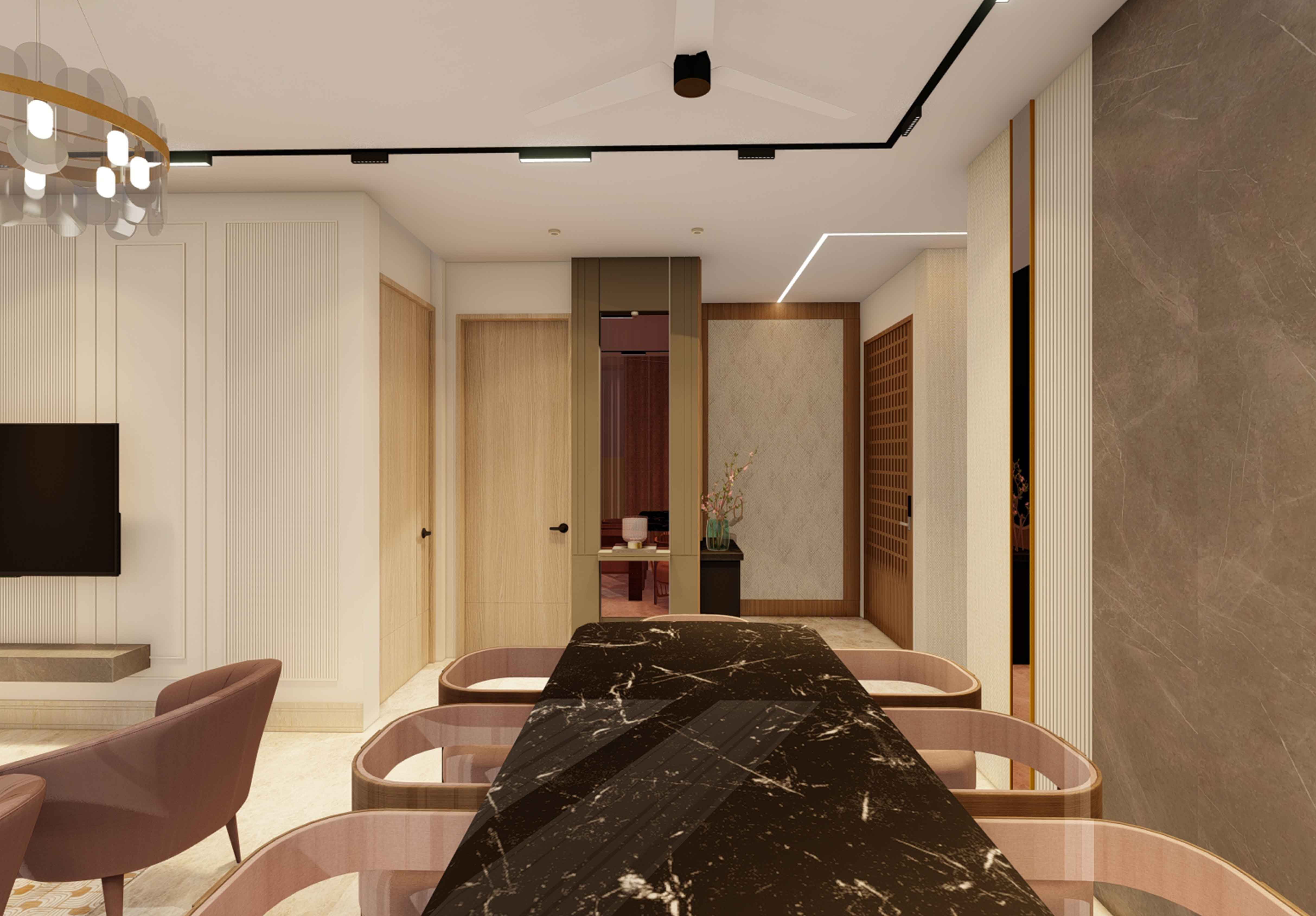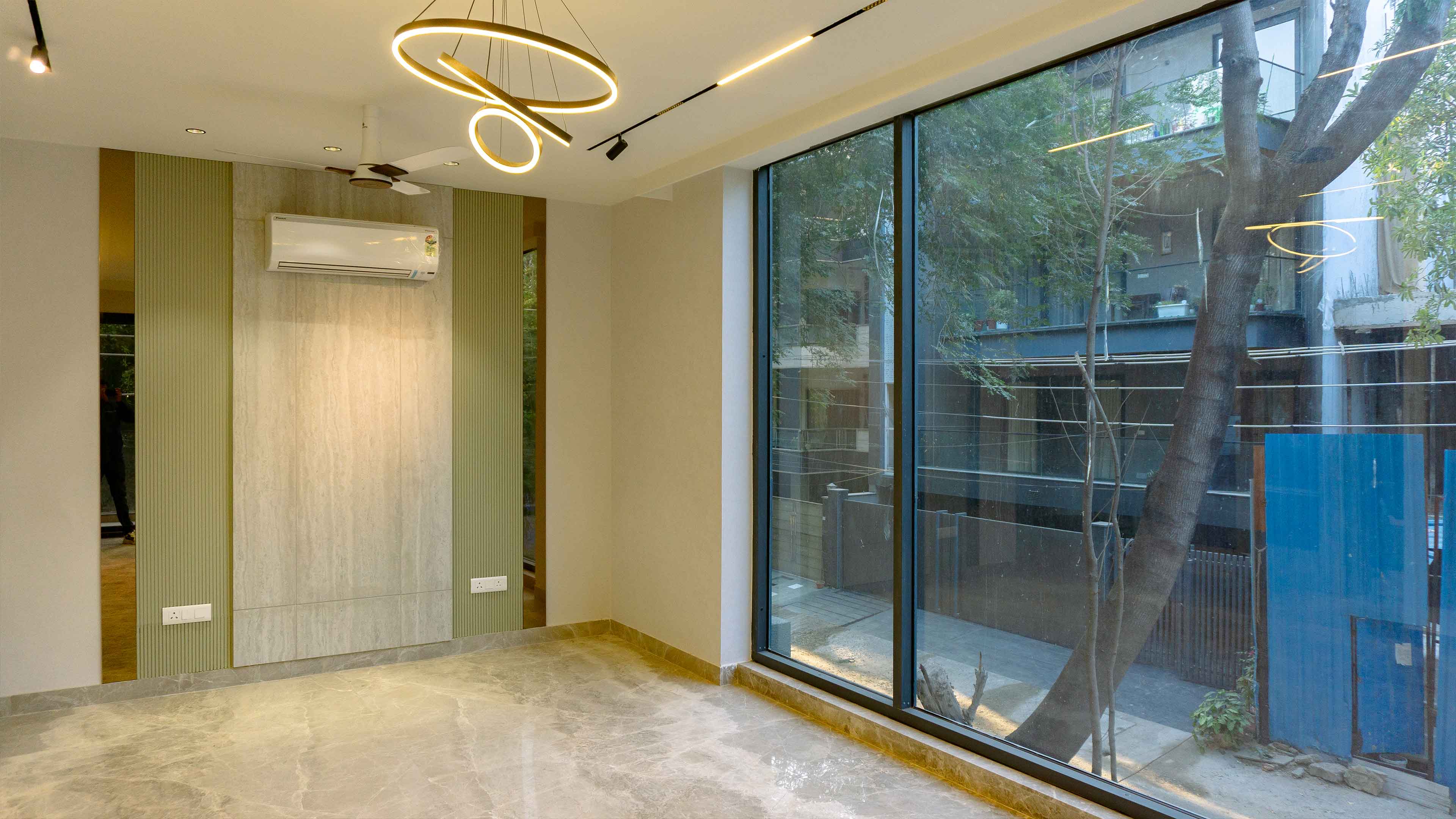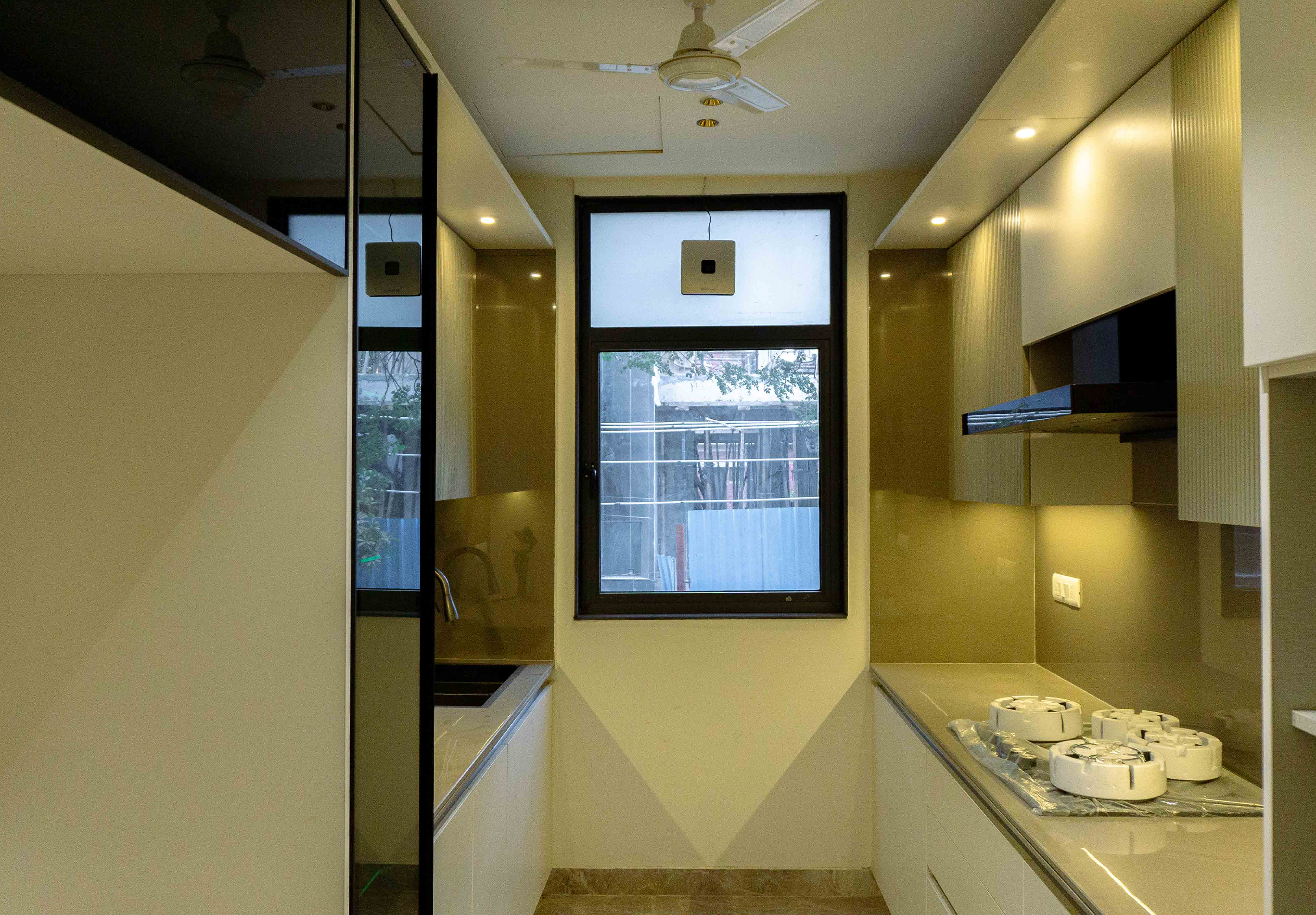 The kitchen was equipped with generous storage, modular fittings, premium woodwork, and layered lighting to enhance both function and style. We used high-end Italian flooring throughout each of the homes. Bedrooms included sleek wardrobes with integrated lighting and metal-framed tinted glass for a refined, contemporary finish.