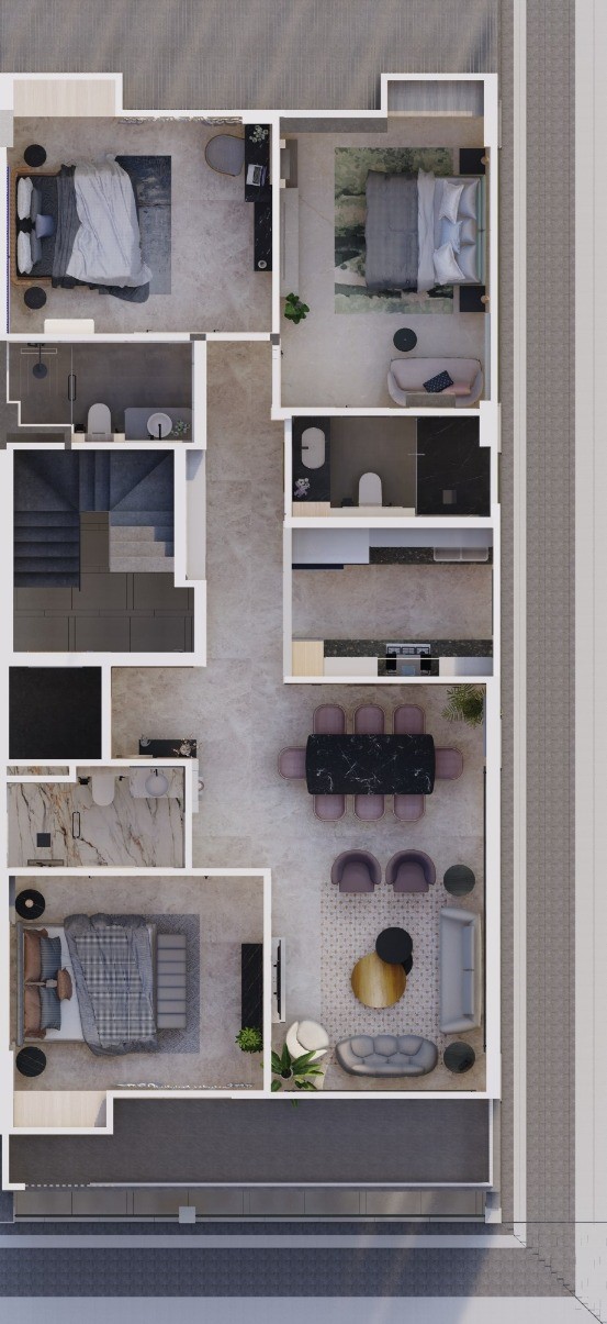 Each upper floor followed an identical layout: a wide entry passage opened into a spacious living and dining area, connected to a modern kitchen separated by a glass partition. Each apartment featured three bedrooms, all with attached washrooms.
